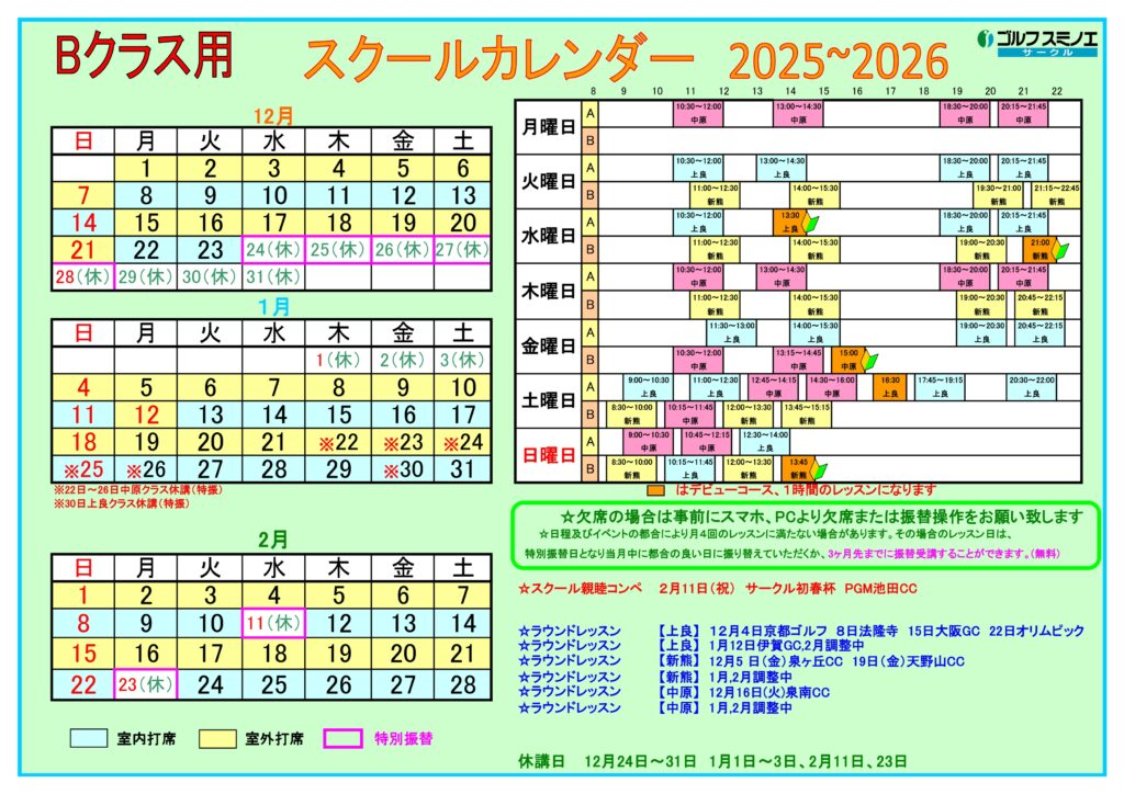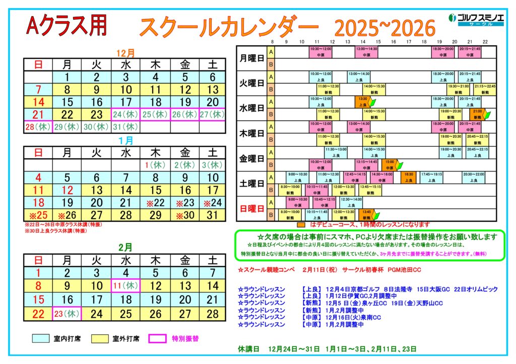 12月・1月・2月 サークル(スクール)カレンダー